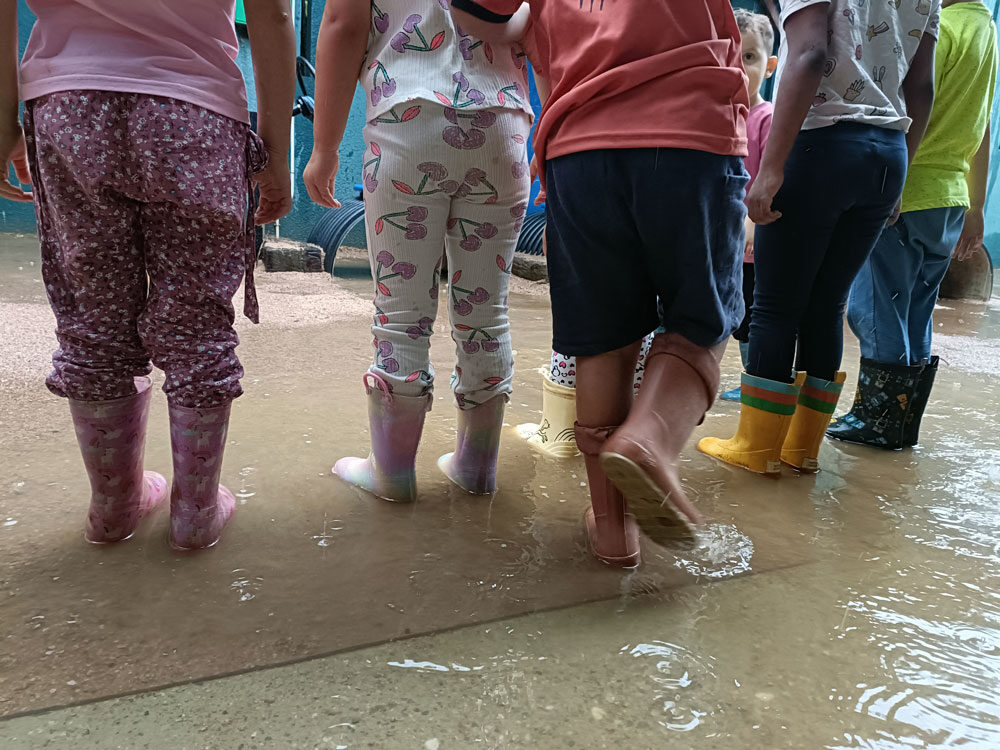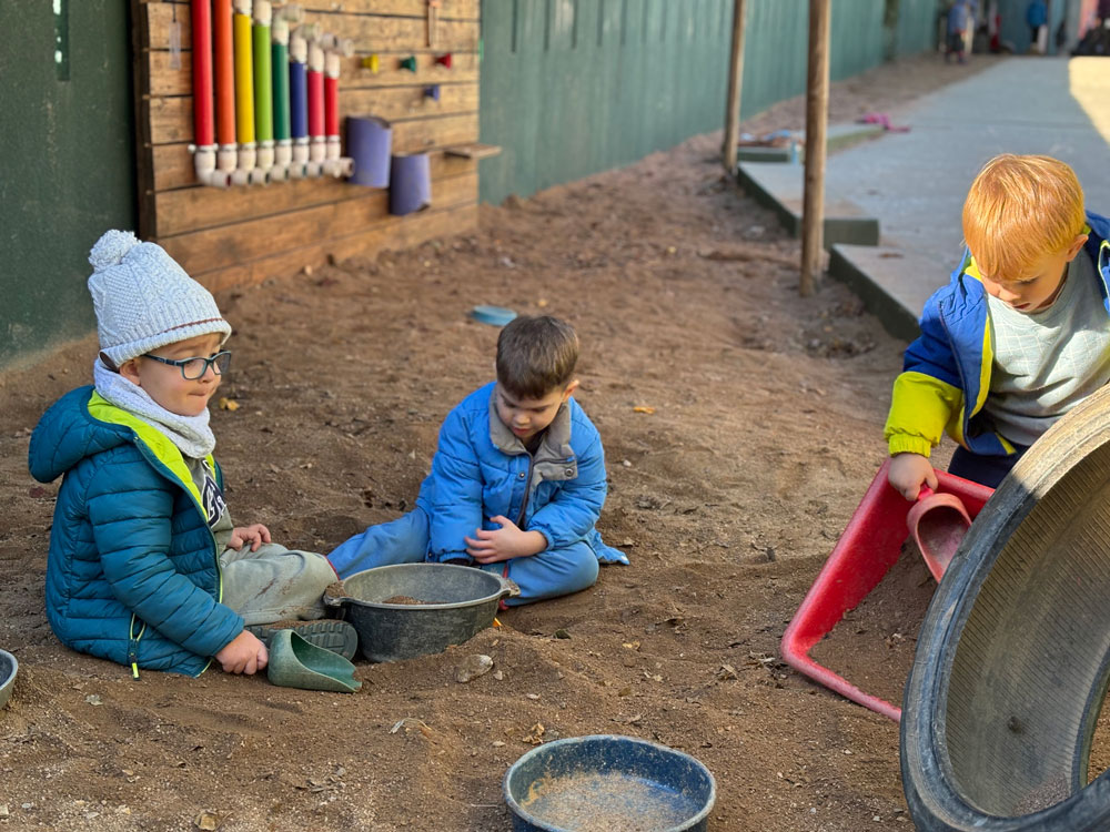 Un pati d’infantil amb porxo, una zona de sorra, una paret musical i altres elements lúdics i sensorials. Un espai exterior cuidat que es revisa i redissenya de forma contínua per incorporar noves millores.